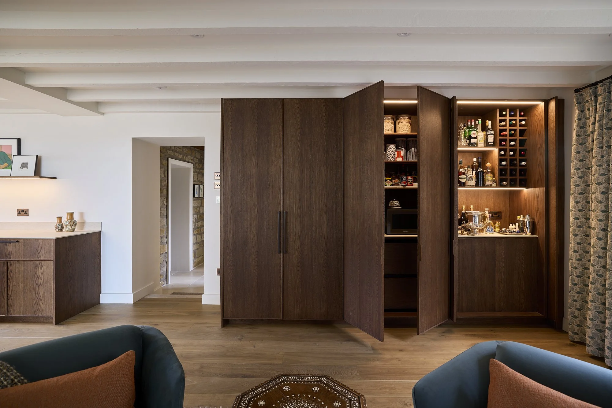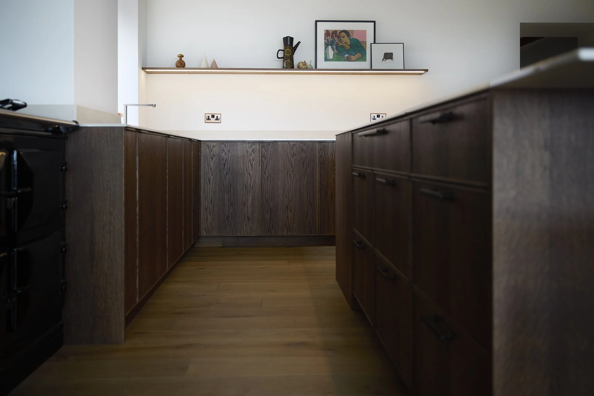 The timber cabinetry wraps the space in a way that feels grounded and architectural. Rather than introducing contrast for the sake of it, we limited the material palette — rich timber, a pale work surface, and restrained detailing — allowing the form and proportion to do the work.
