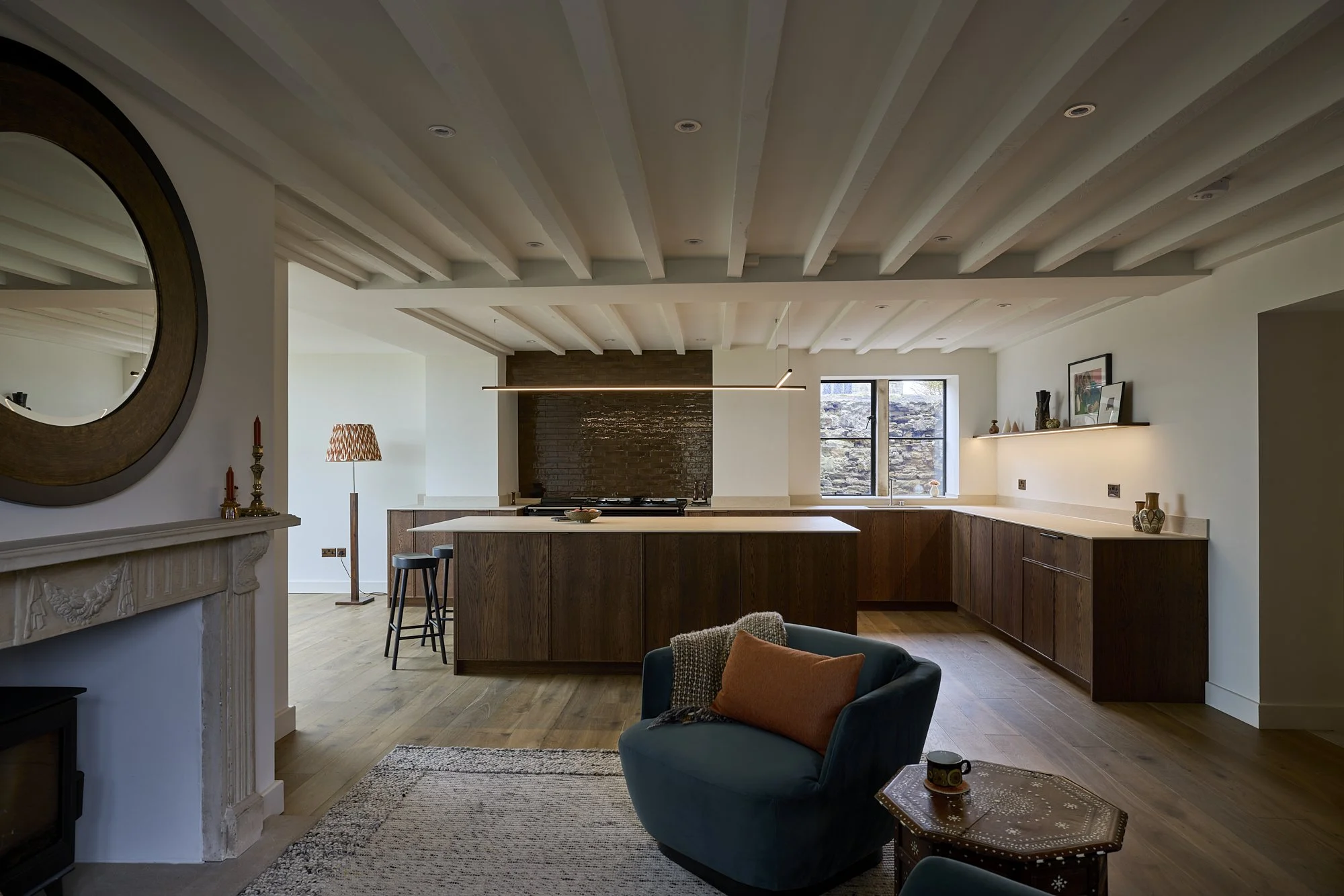 In this project, the long island establishes a clear axis through the room. Its scale is balanced carefully against the ceiling beams and surrounding cabinetry, ensuring it anchors the space without overwhelming it.