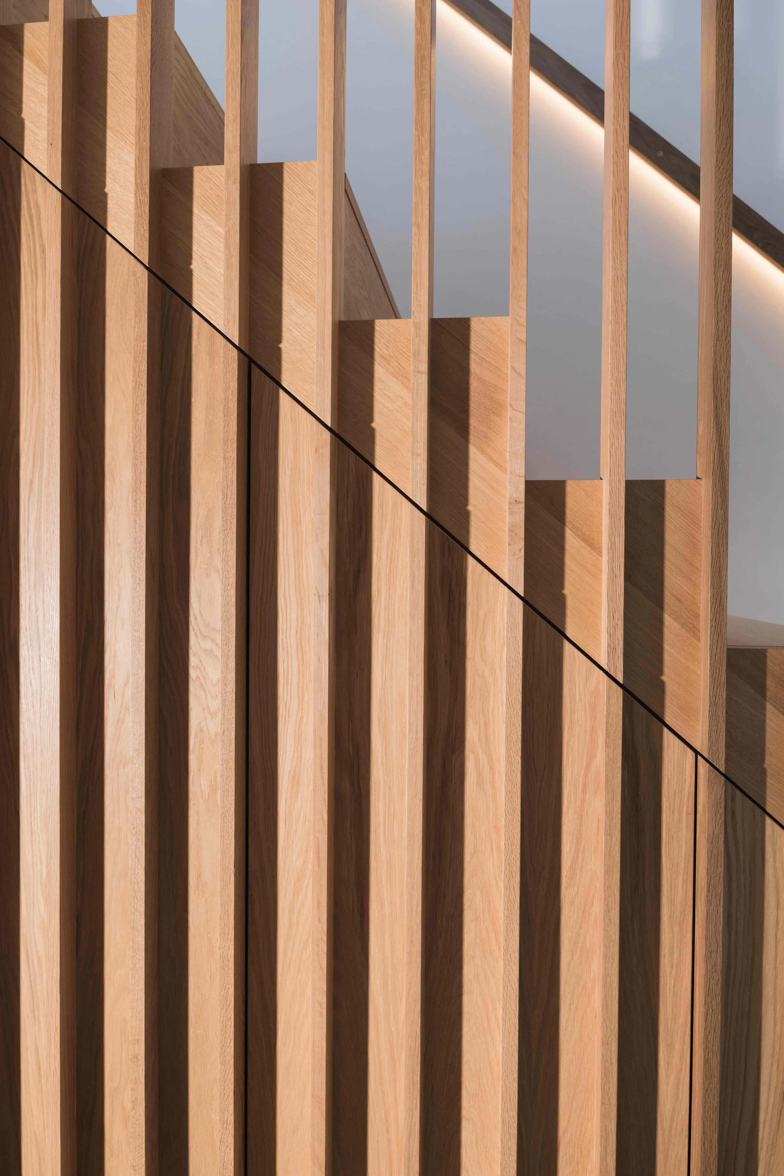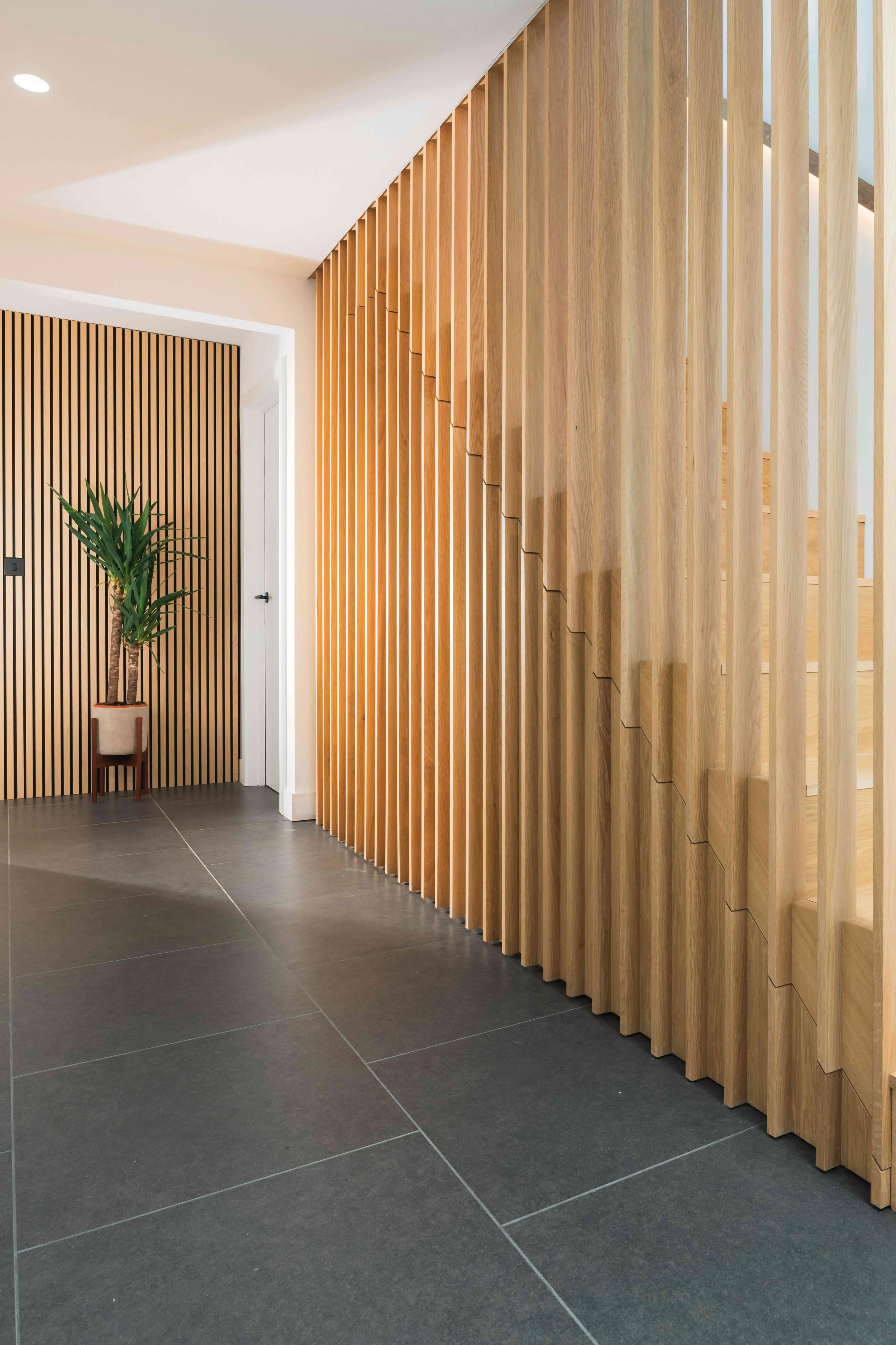 In this Edwalton project, vertical oak slats define the staircase without enclosing it. The detailing allows light to pass through while introducing warmth and rhythm to the entrance.