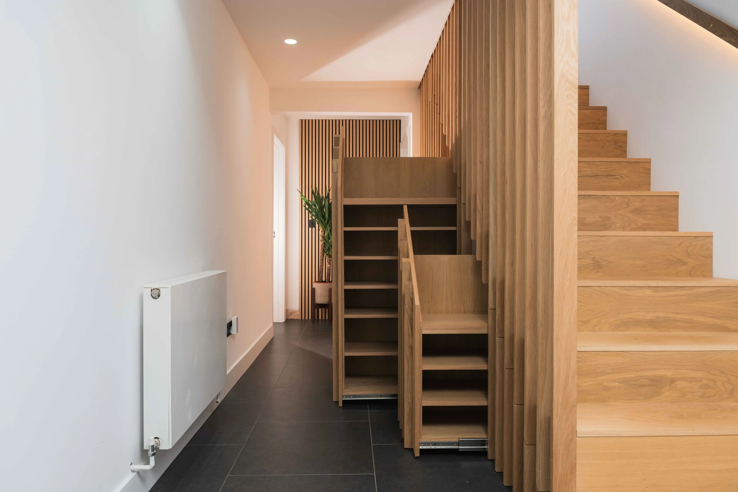 Integrated storage beneath the staircase makes full use of the volume, remaining visually quiet while supporting everyday function.
