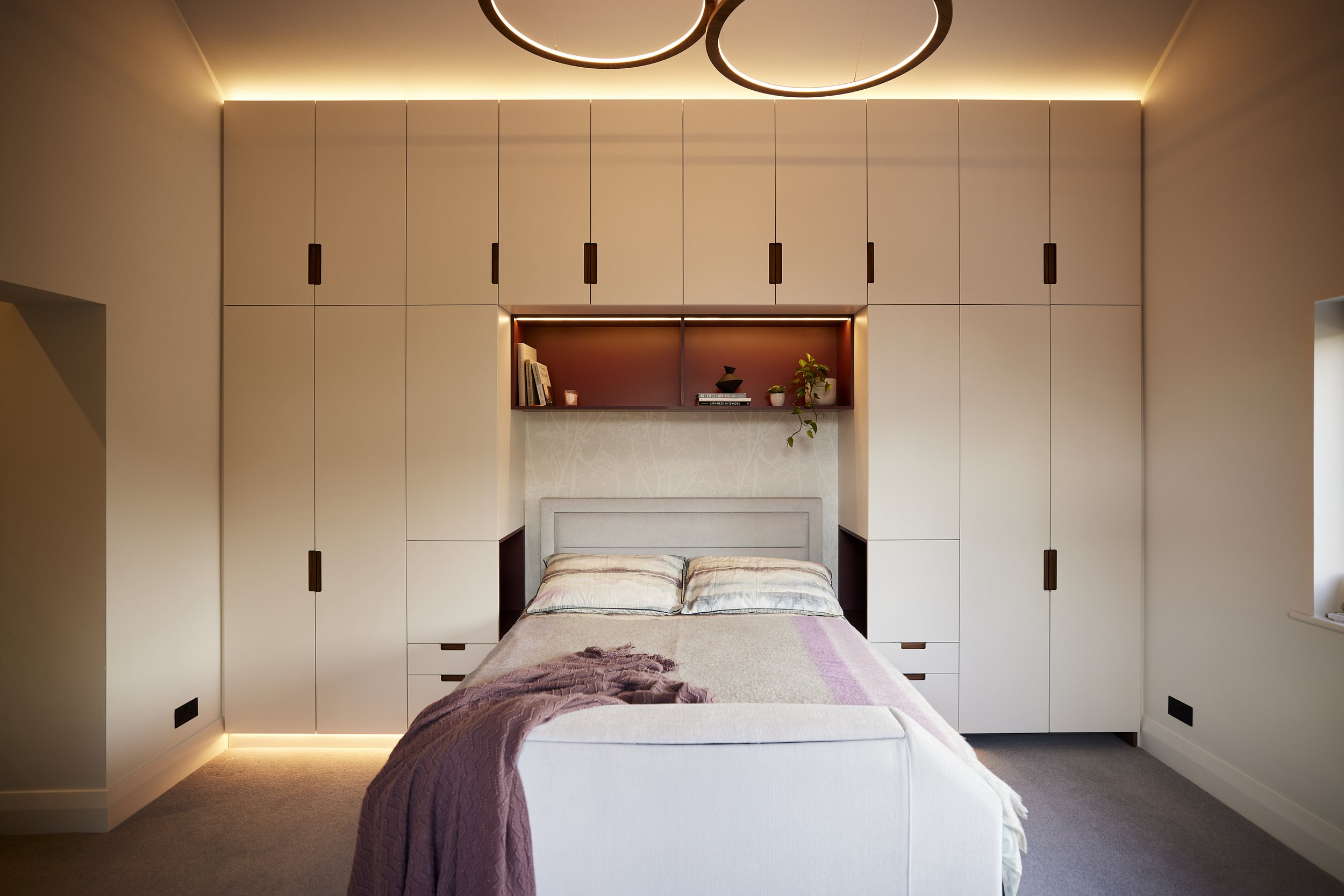 To keep the room feeling calm and uncluttered, we designed a wall of bespoke cabinetry around the bed. This approach allowed us to incorporate wardrobes, drawers and shelving within a single cohesive design while keeping the proportions of the room balanced.
