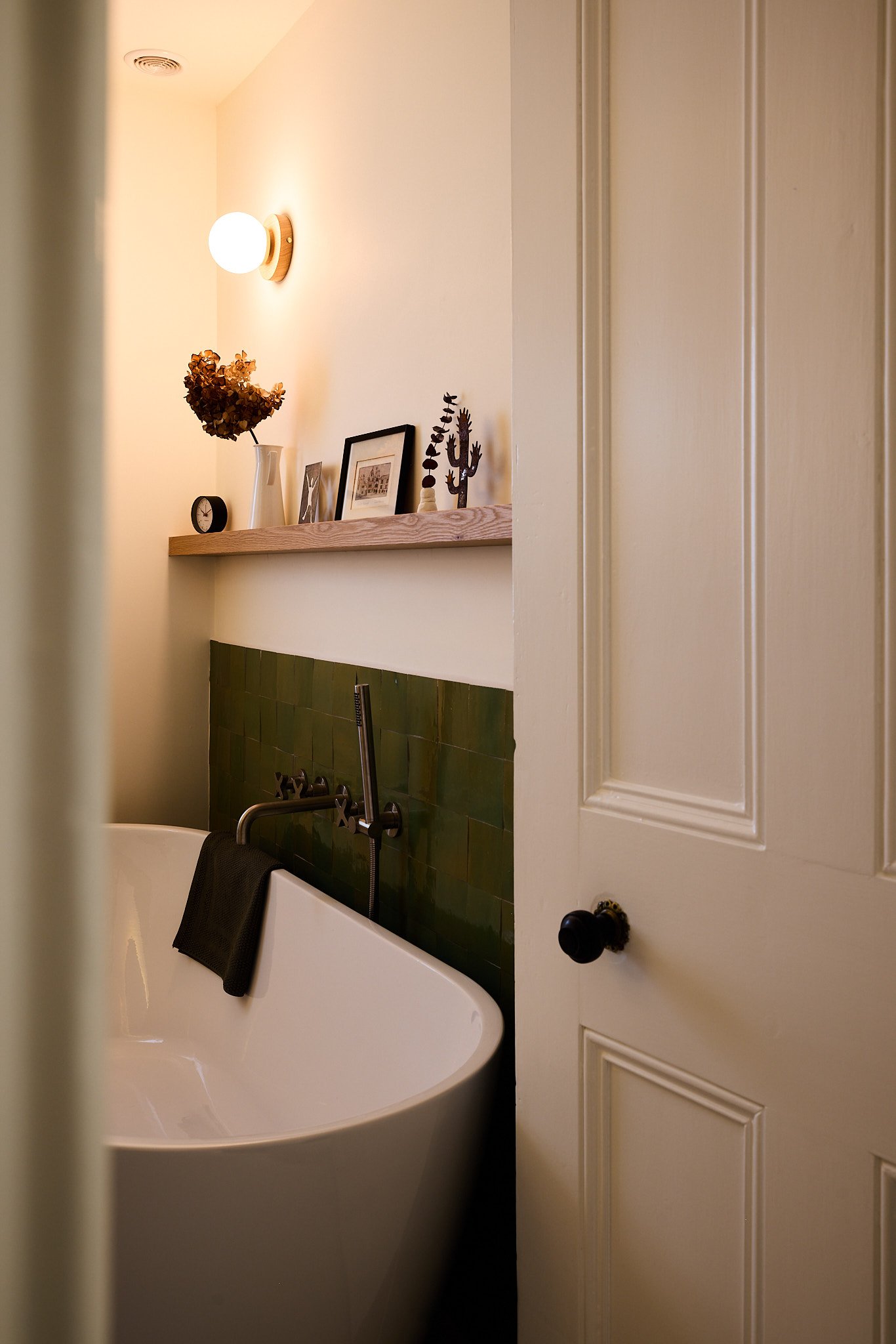 A green colour palette — a different shade from the main bathroom, but still complementary